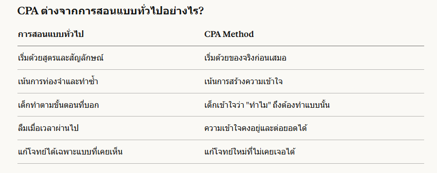 ผลลัพธ์ที่เห็นได้ชัดเมื่อเด็กเรียนด้วย CPA เมื่อเด็กได้เรียนผ่านกระบวนการ CPA อย่างต่อเนื่อง จะพบว่า: เด็กอธิบายได้ว่าทำไม ไม่ใช่แค่บอกคำตอบ เมื่อถามว่า "ทำไมถึงลบ?" เด็กจะอธิบายได้ชัดเจน เด็กไม่กลัวโจทย์ใหม่ เพราะมีเครื่องมือในการคิด ไม่พึ่งพาแค่สูตรที่จำมา เด็กต่อยอดความรู้ได้เอง เมื่อพื้นฐานแข็งแรง เนื้อหาที่ยากขึ้นจะไม่ใช่เรื่องน่ากลัว เด็กมีความมั่นใจในตัวเอง เพราะเข้าใจ ไม่ใช่แค่ทำได้