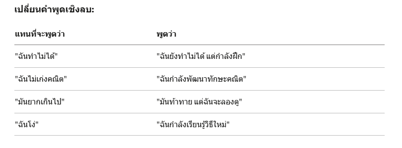 "สมองเหมือนกล้ามเนื้อ ยิ่งฝึก ยิ่งแข็งแรง" "ลูกยังทำไม่ได้ แต่กำลังเรียนรู้" เน้นคำว่า "ยัง" (yet)